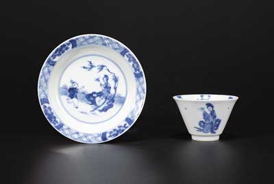 青花人物纹盘、杯