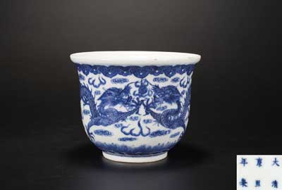 青花双龙戏珠花盆